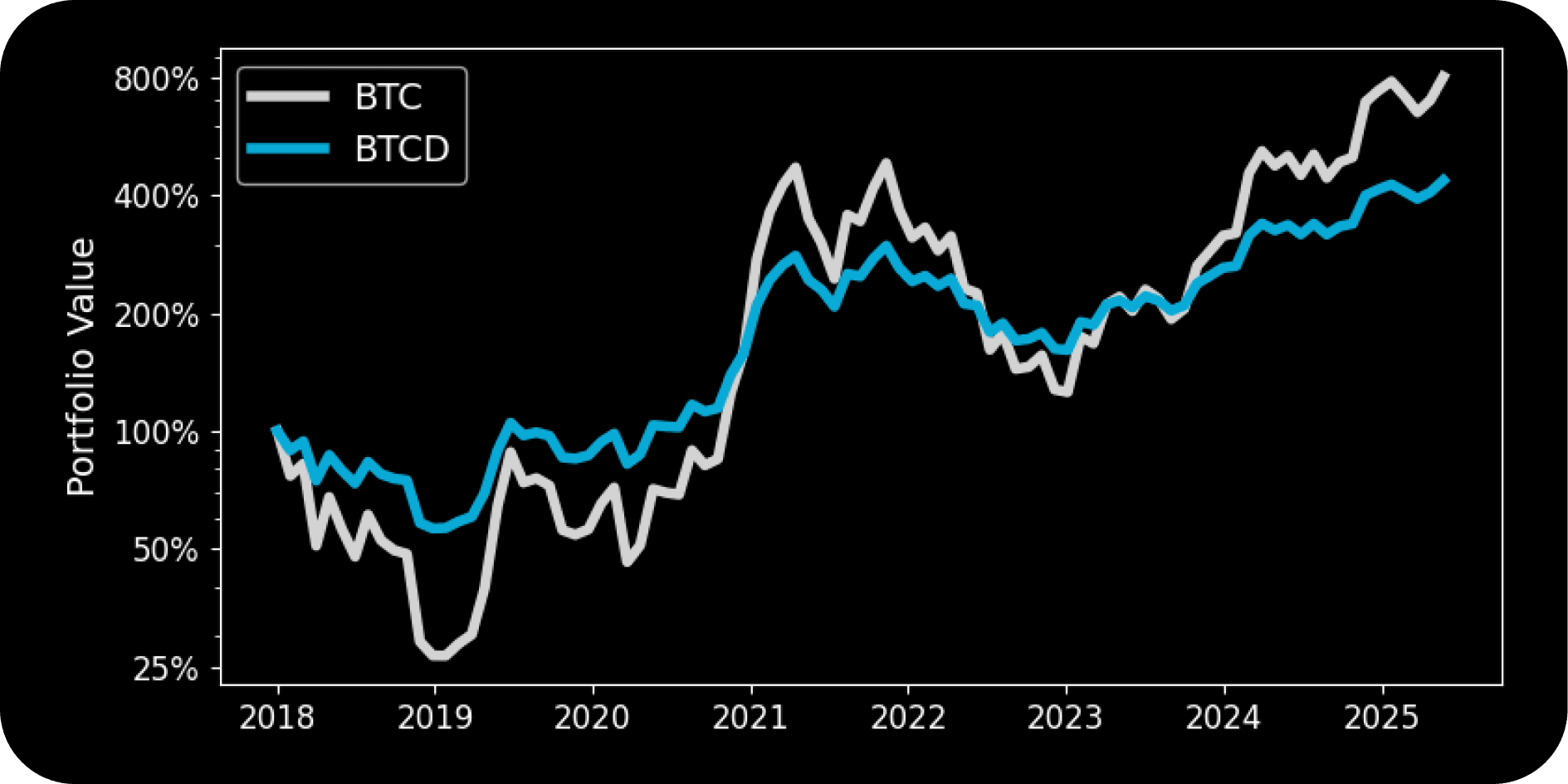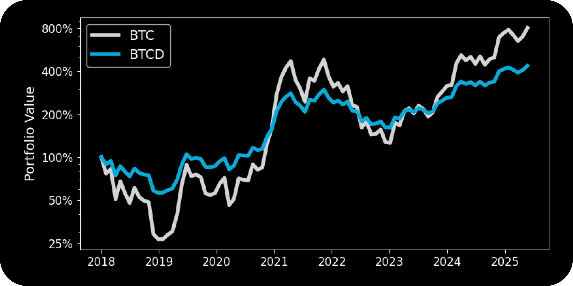 BTCD automatically buys Bitcoin on down days and sells on up days, always keeping 50% exposure. If you believe in the Bitcoin story but want peace of mind, start saving in BTCD.